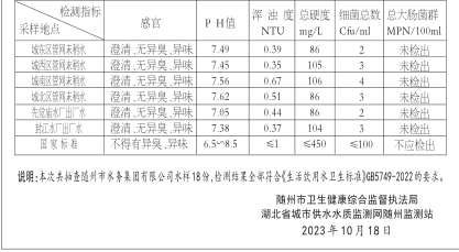 湖北省城市供水水質(zhì)監(jiān)測網(wǎng)隨州監(jiān)測站、隨州市衛(wèi)生健康綜合監(jiān)督執(zhí)法局根據(jù)《城市供水水質(zhì)管理規(guī)定》聯(lián)合于2023年10月17日對隨州市水務集團有限公司先覺廟水廠和封江水廠出廠水和16個管網(wǎng)末稍水水質(zhì)進行了抽樣監(jiān)測,現(xiàn)將抽查檢測結(jié)果公告如下: