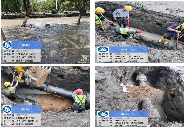 7月6日上午10點20分,客服人員接到群眾的熱線電話,告知清河路清河庭院附近路面大量跑水,運維中心搶修人員接到消息迅速前往,十五分鐘到達現場,通過專業(yè)技能和判斷,確定為DN400主管道爆破,測漏人員立即協(xié)助精準定位漏點,盡量減少開挖面,為搶修爭取時間,該管道會直接影響周邊黃龍五隊、清河庭院、東方小區(qū)、楚苑小區(qū)、雙橋家具大市場等小區(qū)和企業(yè)大面積水小或停水??崾铍y耐,為盡快解決群眾用水問題,維修人員在35°高溫下連續(xù)奮戰(zhàn)8小時,于當晚7點30分恢復正常供水,及時避免了周邊居民下班后正常生活用水的問題。