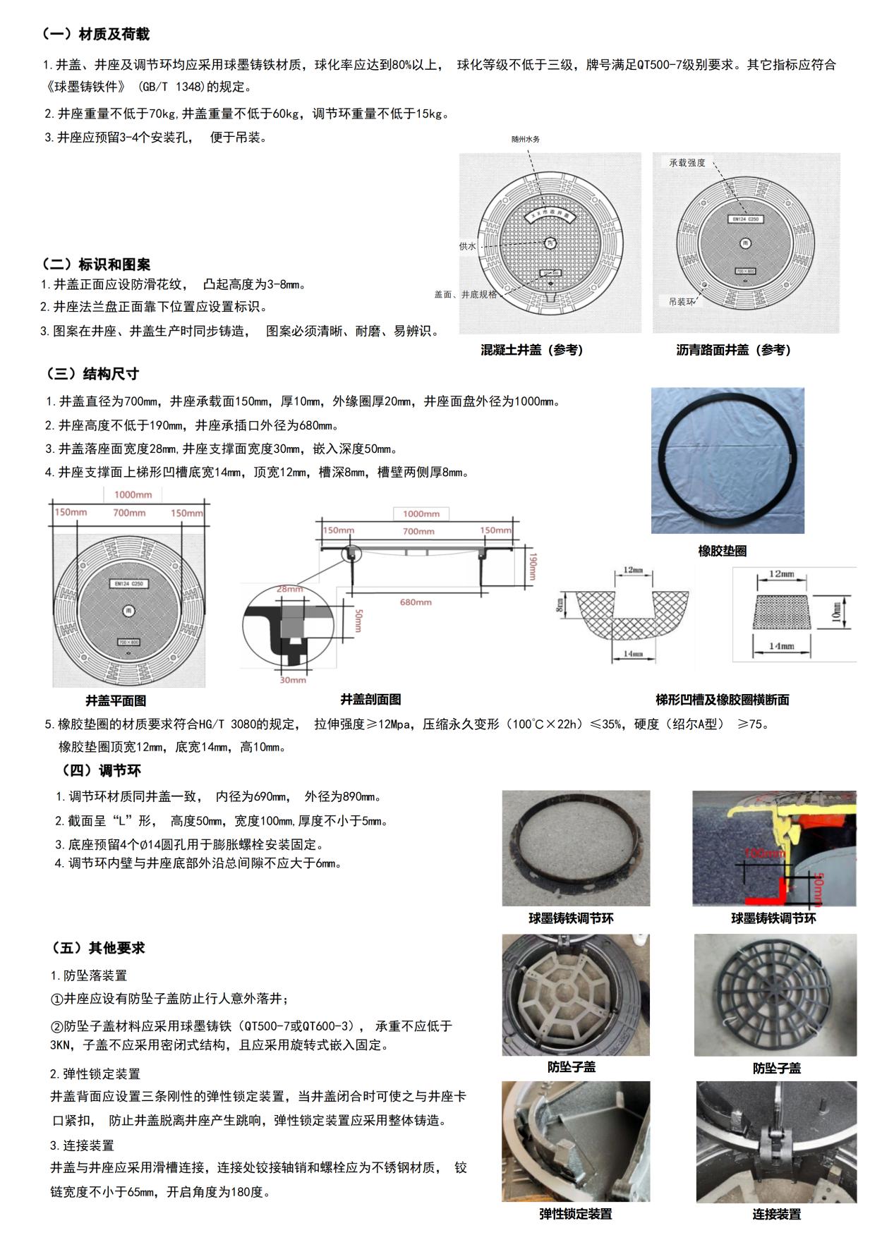 2、井蓋正面應設防滑花紋,凸起高度為3-8mm;井座應設有防墜子蓋防止行人意外落井防墜子蓋材料應采用球墨鑄鐵(QT500-7或QT600-3),承重不應低于3KN,子蓋不應采用密閉式結構,且應采用旋轉(zhuǎn)式嵌入固定。井座重量不低于70kg,井蓋重量不低于60kg,調(diào)節(jié)環(huán)重量不低于15kg(具體規(guī)格型號參照附件5);