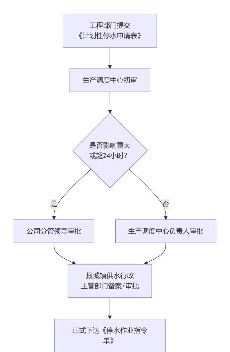 內(nèi)部審批:調(diào)度中心對(duì)停水的必要性、時(shí)長(zhǎng)和范圍進(jìn)行初審。影響范圍廣或停水時(shí)間預(yù)計(jì)超過24小時(shí)的重大作業(yè),需報(bào)公司分管領(lǐng)導(dǎo)批準(zhǔn)。