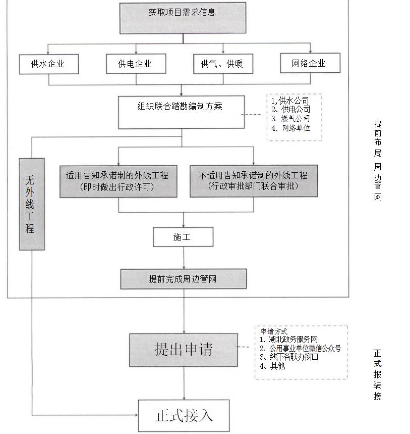 2. 全面精簡(jiǎn)流程環(huán)節(jié)。 實(shí)現(xiàn)水、電、氣、網(wǎng)、暖聯(lián)動(dòng)報(bào)裝接入0環(huán)節(jié)(將踏勘、承諾、施工、接入等環(huán)節(jié)前置)。