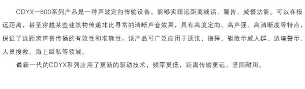 ? ? ? ▼動(dòng)亂、暴亂、騷亂現(xiàn)場(chǎng),暴徒喪心病狂,受蠱惑的群眾也可能情緒失控,警察法規(guī)說教不可能動(dòng)搖其心理防線,動(dòng)槍動(dòng)棒恐傷無辜,釋放催淚瓦斯又有失人道,而“聲霸”精準(zhǔn)瞄準(zhǔn)其骨干分子,高分貝施壓,使起聽覺神經(jīng)無力招架,被迫撤離,既能有效控制局面,平息大亂,又不致命、致傷、致殘,彰顯文明執(zhí)法。